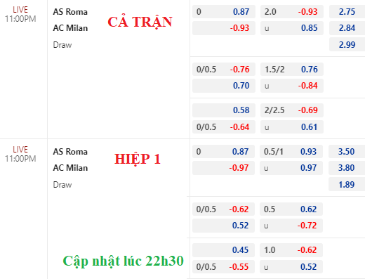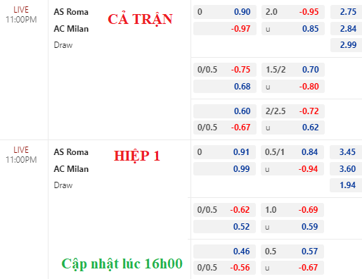 Kèo chính vẫn ở mức chủ chấp về giá và tài xỉu 2 hòa có điểm bỏ sâu cho lựa chọn tài. Khó trông đợi vào kịch bản mở với cột mốc như vậy, đặc biệt khi các trận cầu có AS Roma của Mourinho thường diễn ra tẻ nhạt, khan hiếm bàn thắng.