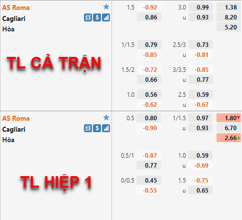 Những thấy đổi trên sàn giao dịch châu Á cho thấy giới đầu tư không mấy tin tưởng vào khả năng thắng kèo của AS Roma trận này, thị trường đang có phần nghiêng về dự đoán trận đấu sẽ khó diễn ra sôi nổi với nhiều bàn thắng được ghi. Nhưng theo chúng tôi với thực lực hiện tại AS Roma hoàn toàn đủ khả năng vượt kèo, mặc dù kết quả gần đây của AS Roma không được tốt nhưng phần nhiều là do họ phải đối đấu với những đối thủ mạnh. Việc được đón tiếp đối thủ yếu như Cagliari sẽ là cơ hội tốt để họ có chiến thắng vực dậy tinh thần.
