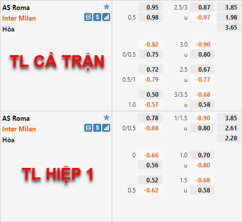 Chốt kèo trực tiếp trận AS Roma vs Inter Milan (00h00):