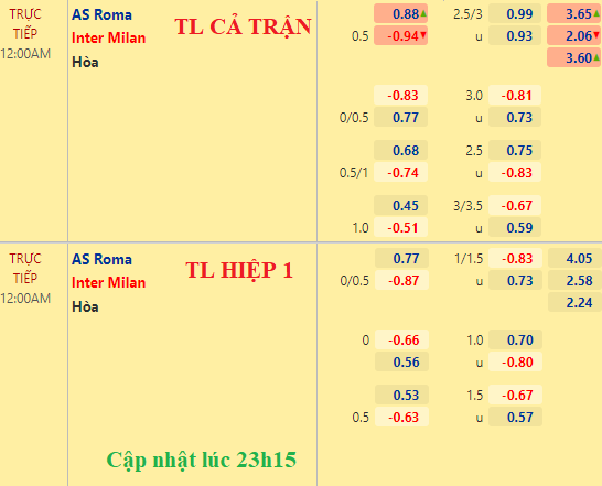 Inter Milan vẫn chấp hòa nhưng điểm ăn cho họ đã tiến đến mức bỏ. Trong khi đó thì mức tài xỉu 2 3/4 cũng chứng kiến lợi nhuận cho cửa tài tăng đáng kể so với sáng nay.