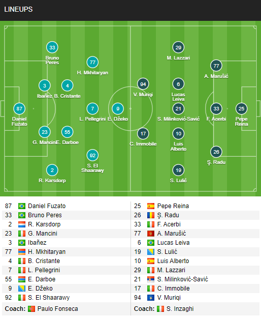 Khác với những đồn đoán trước đó, HLV Paulo Foseca vẫn sử dụng đội hình 4-2-3-1 ở trận này thay vì 3-5-2 mnhw thường thấy. Bên cạnh đó, cũng có 1 số thay đổi nhỏ về nhân sự Bruno Perez được sử dụng thay Santon. Ở phía bên kia chiến tuyến, Lazio chào đón sự trở lại Lucas Leiva ở tuyến tiền vệ trong khi các vị trí còn lại không có thay đổi quá lớn so với trận gặp Inter Milan và đồng thời cho thấy sự khác biệt so với đối thủ.