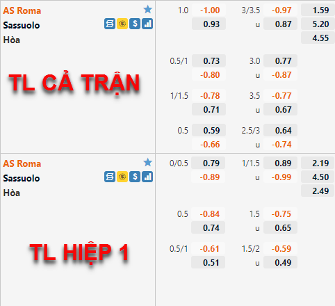 Không có biến động đáng chú ý nào trên sàn giao dịch châu Á khi AS Roma duy trì tỷ lệ chấp 1 hòa cùng lợi điểm cân bằng giữa các lựa chọn đối lập giống như thời điểm đầu phiên. Trên thực tế, đội hình xuất phát không có biến động đáng kể nào so với dự kiến khi Zaniolo, Pellegrini, Mkhitaryan và tân binh Abraham được tin tưởng trong trận đấu thứ 1000 của HLV Mourinho kể từ khi cầm quân.