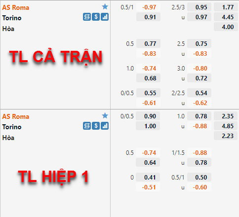 Ở thời điểm hiện tại tỷ lệ chấp chính của đội chủ nhà AS Roma vẫn được nhà cái châu Á duy trì ở mức 3/4 như thời điểm sáng nay, điểm ăn của cửa trên được điều chỉnh tăng so với trước đây nhưng không quá nhiều. Tương tự bên phía tỷ lệ tài xỉu, mốc 2 3/4 vẫn là mốc chính của trận đấu, điểm ăn cửa tài được điều chỉnh giảm đôi chút so với trước đây.