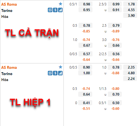 Nhưng diễn biến trên sàn giao dịch châu Á cho thấy giới đầu tư trên sàn giao dịch châu Á không mấy tin tưởng vào khả năng thắng trận của AS Roma trận này. Điều này hoàn toàn dễ hiểu khi AS Roma có tỷ lệ chấp không cao trận này, trận đấu tương tự của mùa giải trước AS Roma đã chấp đối thủ tới 1 1/2. Nhưng theo chúng tôi đội chủ nhà vẫn hoàn toàn đủ cơ hội giành 3 điểm, họ có sự tự tin sau khi giành 2 chiến thắng liên tiếp, trong khi Torino lại thi đấu rất tệ trên sân khách.