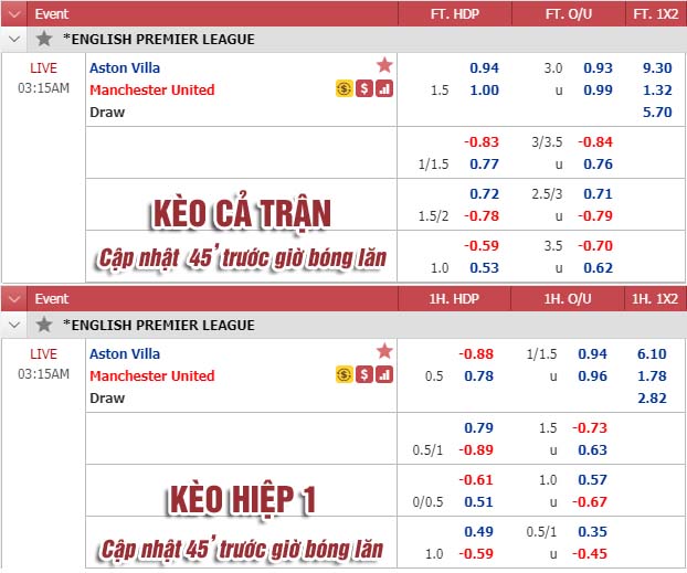 * Chốt kèo trận Aston Villa vs Man Utd (02h15)