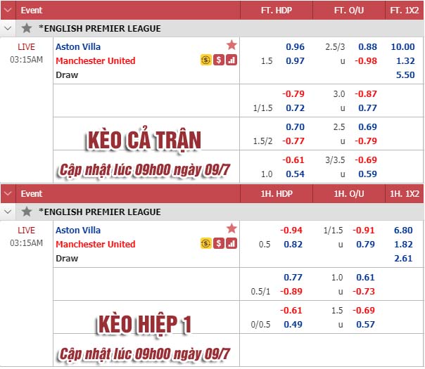 AEGoal.net chốt kèo bóng đá trực tiếp trận Aston Villa vs Man Utd diễn ra lúc 02h15 ngày 10/7 trong khuôn khổ giải Ngoại Hạng Anh sau khi dựa trên tính toán, chuyển động về kèo châu Á và đội hình ra sân của 2 đội.