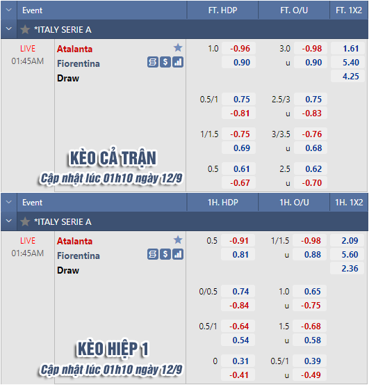 * Chốt kèo trận Atalanta vs Fiorentina (01h45 ngày 12/9)