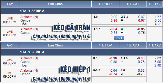 AEGoal.net chốt kèo trực tiếp trận Atalanta vs Genoa diễn ra lúc 20h00 ngày 11/5 sau khi dựa trên tính toán, chuyển động về kèo châu Á và đội hình ra sân của 2 đội.