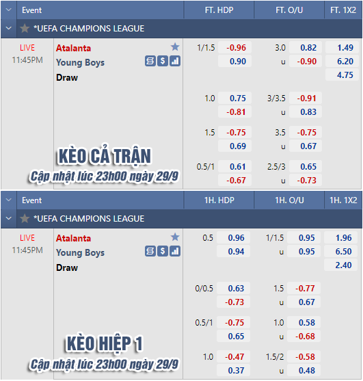 * Chốt kèo trận Atalanta vs Young Boys (23h45 ngày 29/09)