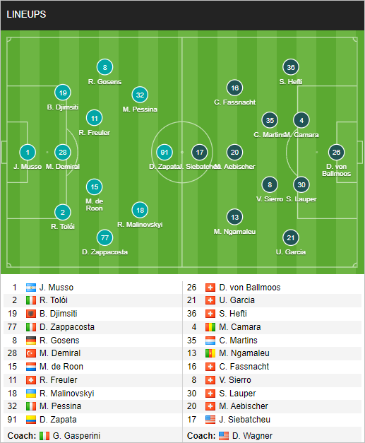 Ngoài Palomino không thể thi đấu và được thay thế bằng Djimsiti thì còn lại đã không có thay đổi nào quá lớn trong đội hình ra sân của Atalanta ở trận này so với cuộc đụng độ cuối tuần trước với Inter Milan. Trong khi bên phía Young Boys, hệ thống sơ đồ 4-4-2 đã được thay bằng 4-2-3-1, sơ đồ giúp họ giành chiến thắng trước Man Utd.