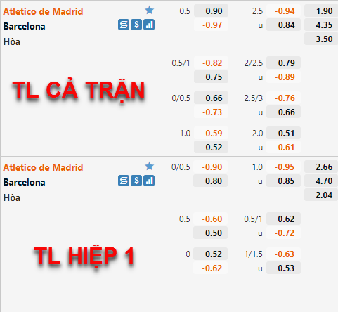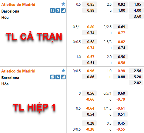 Tỷ lệ chấp của Atletico Madrid vẫn được nhà cái duy trì ở mức 1/2 cả trận như thời điểm trước đây chúng tôi cập nhật nhưng, điểm ăn của cửa trên đã được điều chỉnh tăng nhưng không nhiều. Mốc tài xỉu của trận đấu cũng đang được duy trì ở mức 2 1/2 như trước đây nhưng điểm ăn của cửa tài có xu hướng giảm điểm.