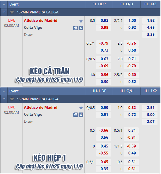 * Chốt kèo trận Atletico Madrid vs Celta Vigo (02h00 ngày 11/9)