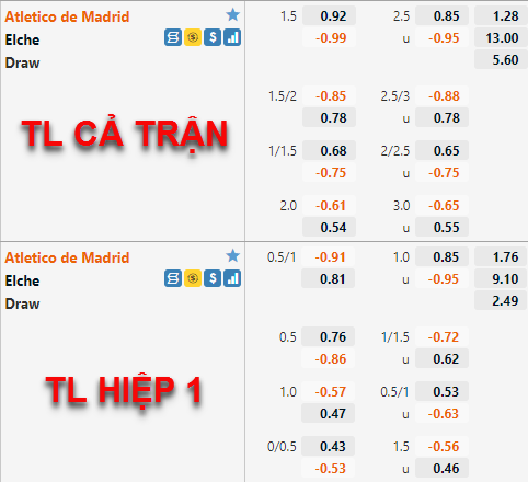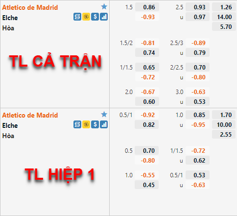 Tỷ lệ chấp của Atletico Madrid vẫn được nhà cái châu Á duy trì ở mức 1 1/2 như thời điểm chúng tôi cập nhật sáng nay, điểm ăn của cửa trên đã được điều chỉnh tăng nhưng không quá nhiều, bên phía tỷ lệ tài xỉu mốc 2 1/2 cũng được giữ là mốc chính của trận đấu như trước đây nhưng điểm ăn cửa cửa tài đã được điều chỉnh giảm đôi chút.