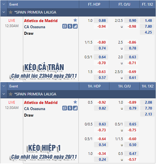 * Chốt kèo trận Atletico Madrid vs Osasuna (00h30 ngày 21/11)
