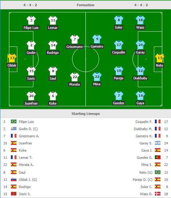 Với Atletico Madrid, rơi điểm trận này cũng không ảnh hưởng đến vị trí thứ 2 hiện tại của họ. Trong khi Valencia đang khát điểm để cạnh tranh top 4 với Getafe hay Sevilla. Đôi bên đều có những tổn thất nhỏ do chấn thương nhưng về cơ bản các trụ cột như Griezmann, Koke, Godin (Atletico) hay Santi Mina, Guedes, Parejo (Valencia) đều xuất hiện ngay từ đầu.