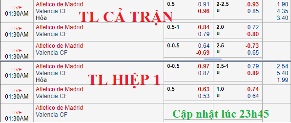 So với thời điểm đầu giờ chiều nay (ngày 24/04) thì tỷ lệ chính không có biến động đáng kể, Atletico Madrid vẫn chấp hòa với lợi nhuận thấp hơn điểm ăn của các vị khách. Trong khi đó, mốc tài xỉu 2 1/4 lại chứng kiến đà giảm điểm đôi chút ở cửa xỉu, từ 0.87 về 0.85. Dẫu vậy thì biến động đó chưa cho thấy xu hướng rõ ràng từ giới đầu tư.