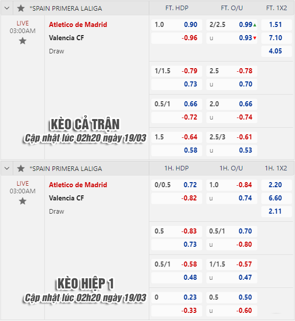 AEGoal chốt kèo bóng đá trực tiếp trận Atletico Madrid vs Valencia diễn ra lúc 03h00 ngày 19/03/2023 trong khuôn khổ giải VĐQG Tây Ban Nha sau khi dựa trên tính toán, chuyển động về kèo châu Á và đội hình ra sân của 2 đội.
