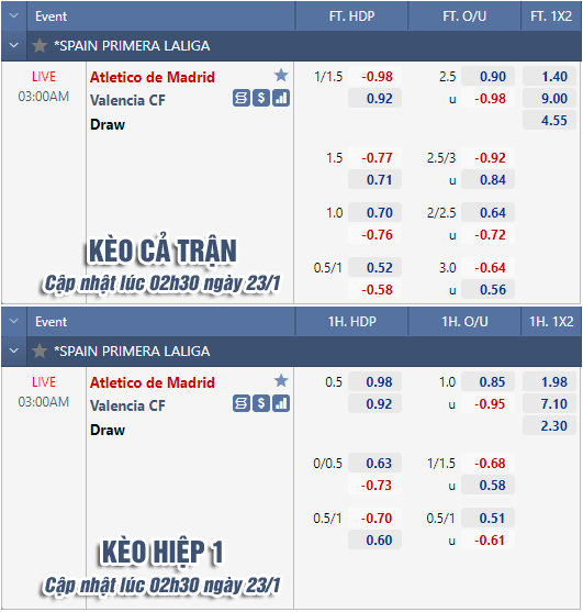 * Chốt kèo trận Atletico Madrid vs Valencia (03h00 ngày 23/1)
