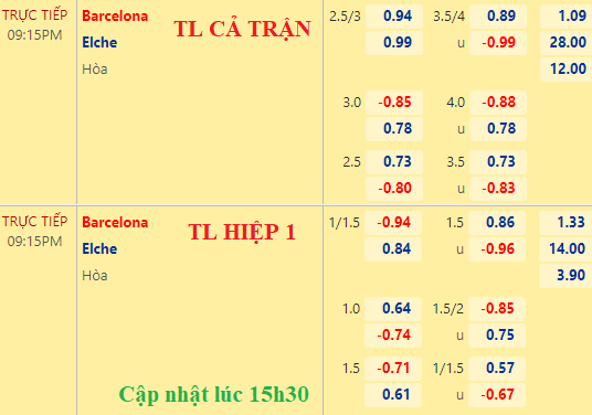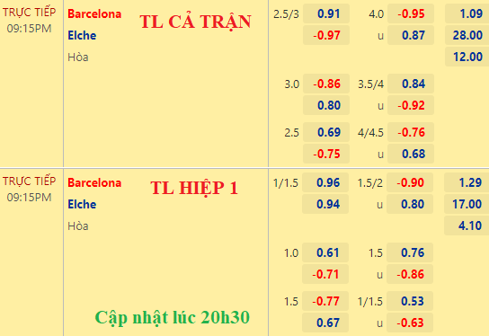 Không sử dụng đội hình mạnh nhất nhưng Barca vẫn duy trì kèo chấp sâu. Trong khi đó, tài xỉu 3 3/4 thậm chí được đẩy lên thành 4 hòa, báo hiệu 1 cuộc chiến tưng bừng. Cách biệt lớn về đẳng cấp giữa đôi bên khả năng sẽ dẫn đến một chiến thắng đậm cho chủ nhà.