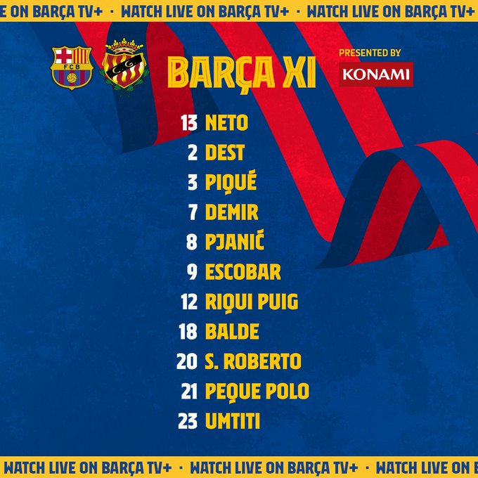 - Barcelona (3-5-2): Pena - Comas, Pique, Mingo - Dest, Pjanic, Puig, Gonzalez, Balde - Escobar, Demir