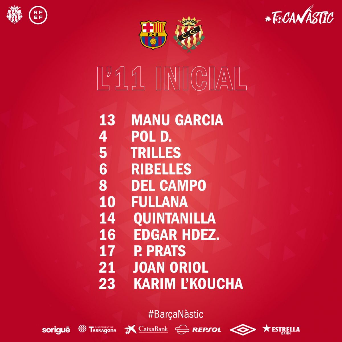 - Gimnastic (4-2-3-1): Garcia - Albarran, Domingo, Trilles, Oriol - Buyla, Fullana - Simon, Del Campo, Carbia - Martin