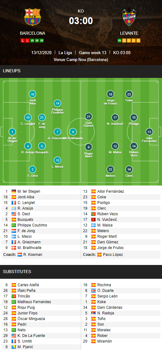 AEGoal chốt kèo bóng đá trực tiếp trận Barcelona vs Levante diễn ra lúc 03h00 ngày 14/12 trong khuôn khổ giải VĐQG Tây Ban Nha sau khi dựa trên tính toán, chuyển động về kèo châu Á và đội hình ra sân của 2 đội.