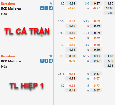 Tỷ lệ của Barcelona có xu hướng tăng điểm thời gian vừa qua. Hiện tại trên sàn giao dịch châu Á đội chủ nhà đã có tỷ lệ chấp chính ở mức 1 3/4 thay cho mức 1 1/2 ở lần chúng tôi cập nhật trước. Mốc tài xỉu của trận đấu lại không có biến động nào đáng kể, mốc 3 hoà vẫn là mốc chính của trận đấu và điểm ăn 2 cửa gần như không có thay đổi.