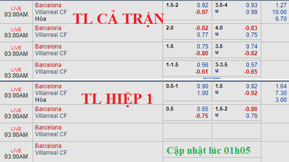 Phía đối diện, Villarreal có sự xuất hiện của Cazorla cùng Moreno - những nhân tố đáng chú ý nhất của các vị khách. So với thời điểm sáng ngày 24/9, Barca vẫn giữ được kèo chấp 1 3/4 nhưng thay vì điểm bỏ, lợi nhuận cho cửa chủ nhà lúc 01h05 chỉ là 0.92. Mốc tài xỉu 3 3/4 cũng chứng kiến điểm ăn cho cửa tài giảm từ mức bỏ về còn 0.99. Với tỷ lệ và đội hình đó, nên tin vào Barca ở cuộc chiến này!