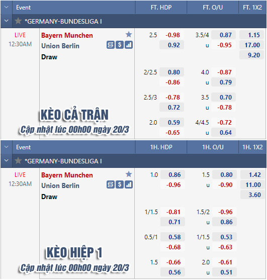 * Chốt kèo trận Bayern Munich vs Union Berlin (00h30 ngày 20/3)
