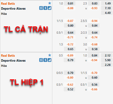 Tỷ lệ chấp dao động giữa mức 1 hòa và 1 1/4 của Betis thời điểm sáng 18/1 đã ổn định ở mức 1 hòa, nhưng điểm ăn cho chủ nhà lại cao hơn cửa dưới. Đáng nói là dù handicap chủ chấp như vậy nhưng tài xỉu vẫn chỉ là 2 3/4 với điểm bỏ. Alaves chủ động chơi thấp với sơ đồ 4-4-2, điều đó khiến khả năng cởi mở trận này khó xuất hiện.