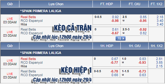 AEGoal.net chốt kèo trực tiếp trận Betis vs Espanyol diễn ra lúc 2h00 ngày 30/4 sau khi dựa trên tính toán, chuyển động về kèo châu Á và đội hình ra sân của 2 đội.