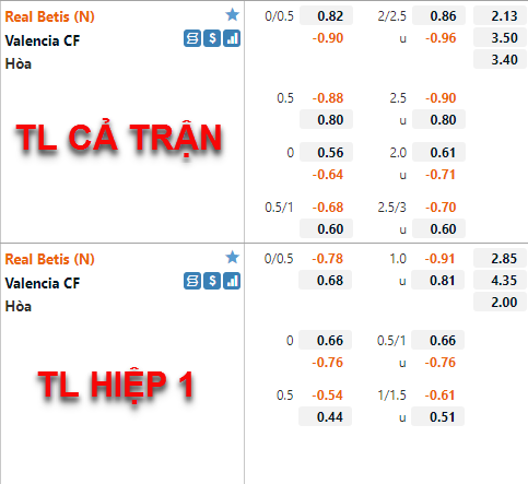 AEGoal chốt kèo bóng đá trực tiếp trận Betis vs Valencia diễn ra lúc 03h00 ngày 24/4 trong khuôn khổ cúp nhà Vua Tây Ban Nha sau khi dựa trên tính toán, chuyển động về kèo châu Á và đội hình ra sân của 2 đội.