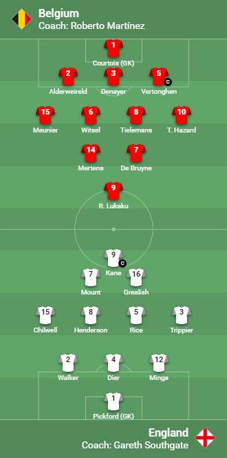 Bỉ: Courtois; Alderweireld, Denayer, Boyata; Meunier, Tielemans, Witsel, T. Hazard; De Bruyne, Mertens; Lukaku