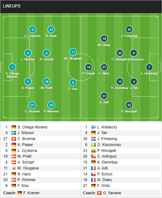 Leverkusen: Andrich phải ngồi ngoài vì án treo giò. Baumgartlinger, Fosu-Mensah, Palacios và Tapsoba chưa bình phục chấn thương. Khả năng ra sân của Kossounou chưa chắc chắn.