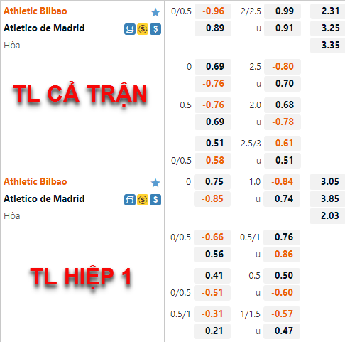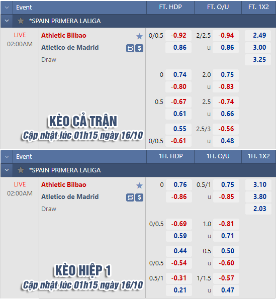 * Chốt kèo trận Bilbao vs Atletico Madrid (02h00 ngày 16/10)