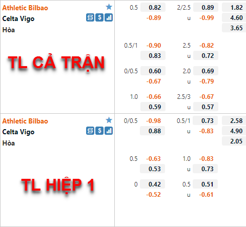 Tỷ lệ chấp của trận đấu đã có những biến động đáng kể thời gian vừa qua. Bilbao vẫn đang có tỷ lệ chấp chính 3/4 nhưng điểm ăn của cửa trên đã được điều chỉnh giảm tương đối so với trước đây. Trong khi đó mốc tài xỉu của trận đấu ít biến động hơn, mốc 2 1/4 vẫn là mốc chính của trận đấu và điểm ăn 2 cửa không có nhiều thay đổi so với trước đây.