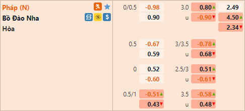Những diễn biến trên sàn giao dịch đem lại dấu hiệu tốt cho lựa chọn cửa trên và tài trận này. Điều này hoàn toàn hợp lý khi xét về lực lượng ĐT Pháp vẫn là đội có chất lượng tốt hơn, thêm vào đó đội đương kim vô địch thế giới cần 3 điểm để chắc ngôi đấu bảng F qua đó họ sẽ tránh được việc phải đối đầu với ĐT Anh ngay ở vòng 1/8. Trong khi đó với hoàn cảnh hiện tại ngay cả thật bại trận đấu này ĐT Bồ Đào Nha cũng không có nhiều khả năng bị loại. Không có quá nhiều sức ép về mặt điểm số khả năng ĐT Bồ Đào Nha tiếp cận trận đấu một cách cởi mở là rất cao, điều này đồng nghĩa với việc trận đấu có thể diễn ra sôi nổi.