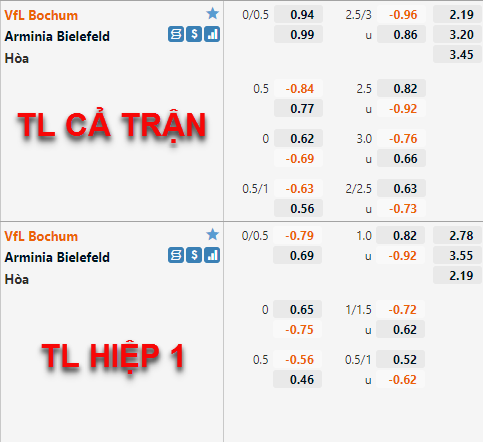 Trên sàn giao dịch châu Á gần như không chứng kiến dịch chuyển đáng chú ý nào cả về chỉ số tỷ lệ cả trận cũng như bàn thắng cả trận. Bochum vẫn được niêm yết với kèo chấp tối thiểu 1/4 cùng lợi nhuận cân bằng giữa các lựa chọn đối lập. Kèo bàn thắng cũng ở mức 2 3/4 với lợi nhuận bỏ đáng kể cho kịch bản tưng bừng bàn thắng.