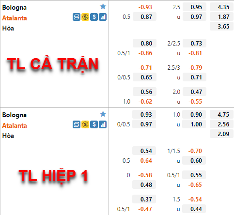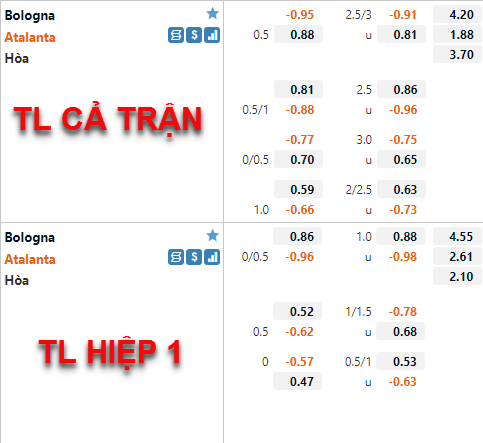 Tỷ lệ của trận đấu hiện tại gần như không có thay đổi nào đáng kể so với lần chúng tôi cập nhật trước. Tỷ lệ chấp chính của Atalanta tiếp tục được duy trì ở mức 1/2 và mức điểm ăn của 2 cửa cũng không có biến động nào đáng kể so với trước đấy. Trong khi đó mặc dù tỷ lệ tài xỉu chính vẫn được giữ ở mức 2 1/2 như trước đây nhưng điểm ăn của cửa tài đã được điều chỉnh tăng đáng kể.