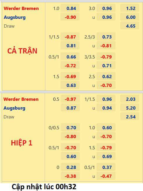 Trên sàn giao dịch châu Á lúc này vẫn chứng kiến làn sống đổ vào Bremen chiếm ưu thế đáng kể so với chiều ngược lại. Cụ thể, kèo chấp 1 hòa của đội chủ nhà đã bị điều chỉnh lợi nhuận xuống rất thấp so với hồi đầu phiên. Tong khi đó, cửa dưới ngày càng bị điều chỉnh bỏ khá sâu và tiến sát lên mốc được chấp 1 1/4.
