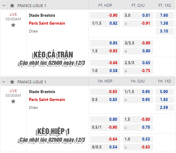 * Chốt kèo trận Brest vs PSG (03h00 ngày 12/3)