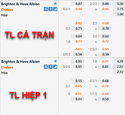 Với đội hình như vậy, Brighton mất giá trầm trọng. Vẫn là kèo Chelsea chấp 3/4 nhưng nếu như sáng 18/1, điểm ăn cho khách còn bỏ sâu thì trước giờ bóng lăn chừng 50p đã xuống thấp hơn cả cửa dưới. Tung vào sân những nhân tố như vậy, Brighton khó tạo nên bất ngờ như ở lượt đi.