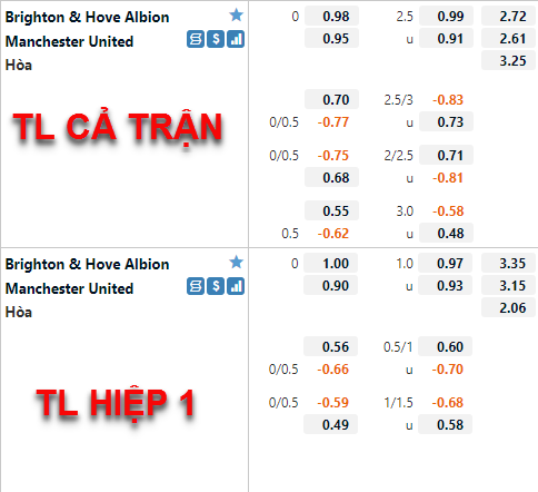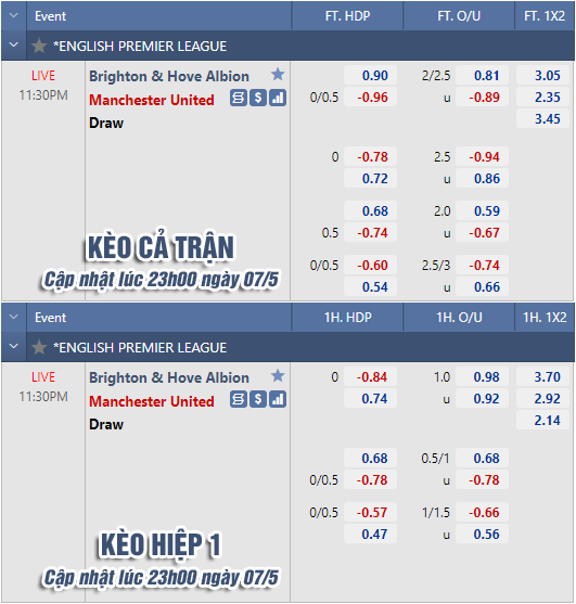 AEGoal chốt kèo bóng đá trực tiếp trận Brighton vs Man Utd diễn ra lúc 23h30 ngày 07/05 trong khuôn khổ giải Ngoại hạng Anh sau khi dựa trên tính toán, chuyển động về kèo châu Á và đội hình ra sân của 2 đội.