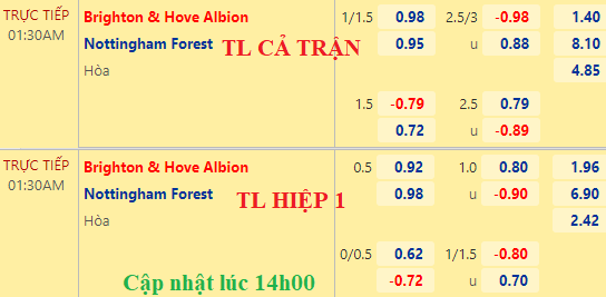 Chốt kèo trực tiếp trận Brighton vs Nottingham Forest (01h30):