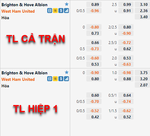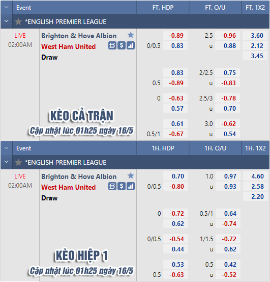 * Chốt kèo trận Brighton vs West Ham (02h00 ngày 16/5)