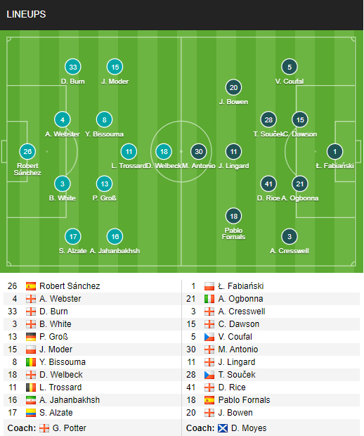 Đã không có quá nhiều sự thay đổi trong đội hình ra sân của Brighton ở trận này. Trong khi đó bên phía West Ham, mặc dù cũng có 1 vài thay đổi nhưng về cơ bản những cái tên chủ chốt vẫn có mặt và đồng thời tạo ra thế vượt trội so với đội chủ nhà của thầy trò HLV David Moyes.
