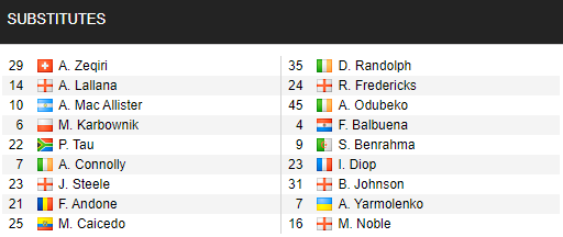 Brighton: Sanchez; White, Webster, Burn; Gross, Lallana, Bissouma, Moder; Mac Allister, Trossard; Welbeck