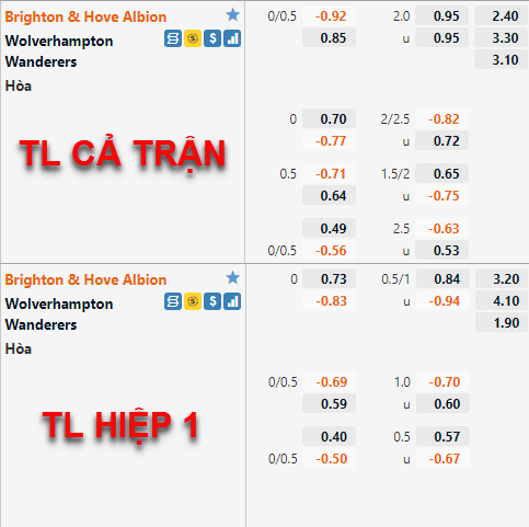 Biến động trên sàn giao dịch đem lại dấu hiệu tích cực cho lựa chọn cửa trên và tài trận này. Ở thời điểm hiện tại Brighton không còn duy trì được phong độ như thời điểm đấu mùa giải nhưng việc họ được nhà cái đánh giá cao với tỷ lệ chấp 1/4 đã giúp đội chủ nhà có được sự ủng hộ từ giới đầu tư, điều này cũng không quá vô lý bới Wolves mùa giải này thường chỉ chơi tốt khi phải đối đầu với những đối thủ vượt trội so với họ.