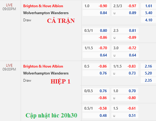 Vì thế, sàn châu Á chứng kiến đà mất giá của Brighton khi từ chấp 1 1/4 về còn chấp 1 hòa, lại còn bỏ sâu. Tài xỉu 2 3/4 ăn ít cũng được điều chỉnh thành điểm bỏ cho lựa chọn tài. Với đội hình và biến động tỷ lệ như vậy, nên tin vào cửa dưới.