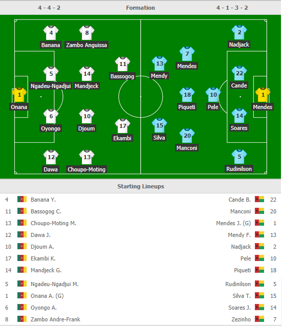 Cameroon (4-3-3): Onana - Oyongo, Yaya, Bong, Fai - Anguissa, Djoum, Mandjeck - N'Jie, Choupo-Moting, Ekambi